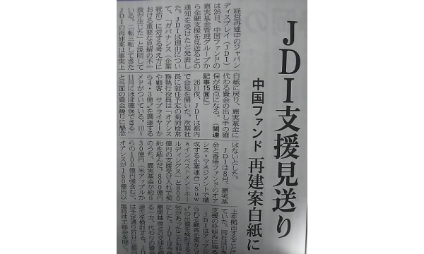 ジャパンディスプレイ(以下JDI)に対して中国ファンドからの支援が見送られた、という記事です。